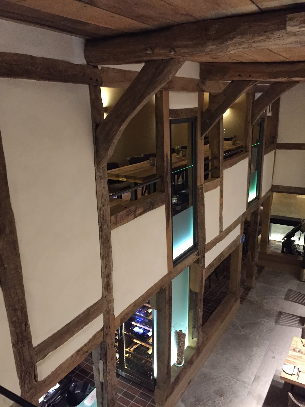 Altes Fachwerk, kubischer moderner Anbau, sehr geschmackvolle Innenausbauten, ein herrlicher Innengarten, ein super Biergarten und ja – das Essen ist köstlich!