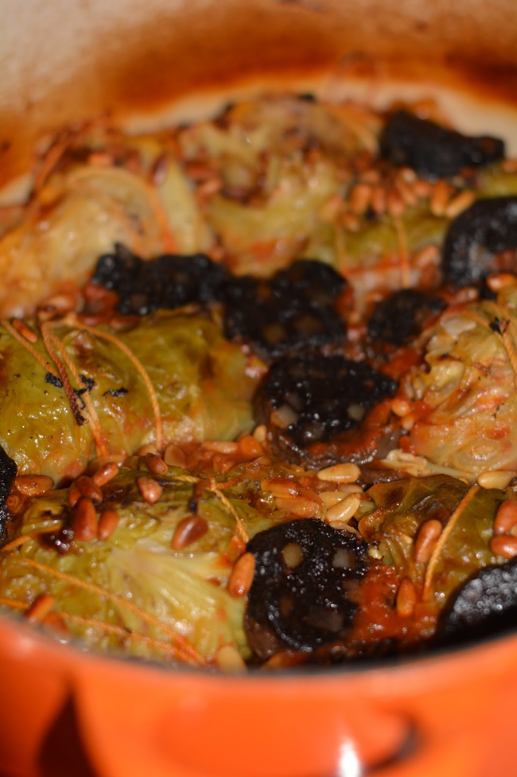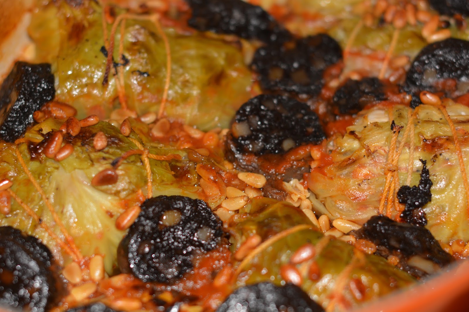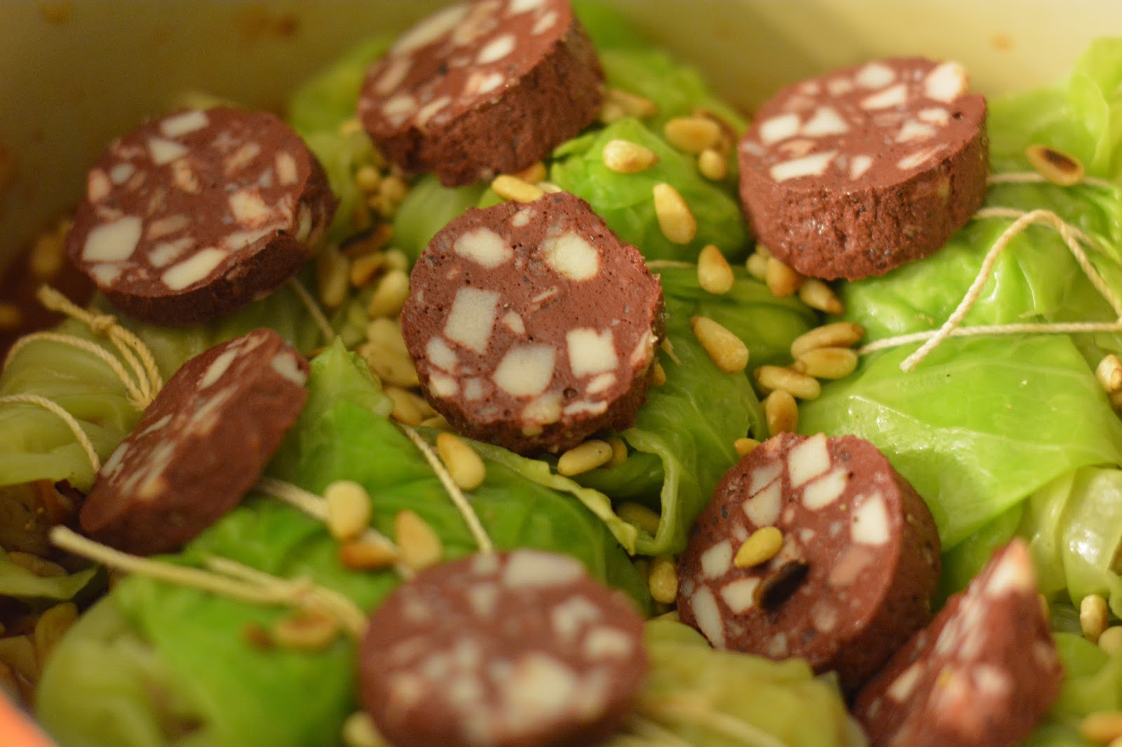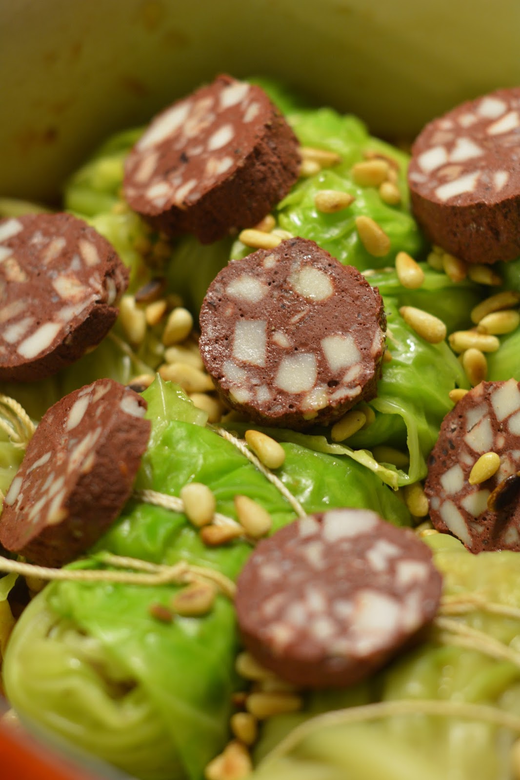 Die gerösteten Pinienkerne und die in Scheiben geschnittene Blutwurst drauf legen.