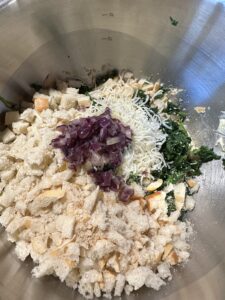 In eine große Schüssel gebt ihr die klein geschnittenen Brötchen, die Milch und die Eier sowie den geriebenen Käse, das Salz und den Pfeffer. Jetzt noch das Mehl dazu und alles gut durchkneten.