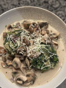 Am Tegernsee mögen wir super gerne auf den Hütten SPINATKNÖDEL mit PILZRAHMSAUCE nach einer Wanderung essen.